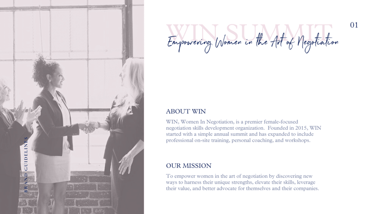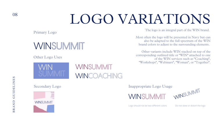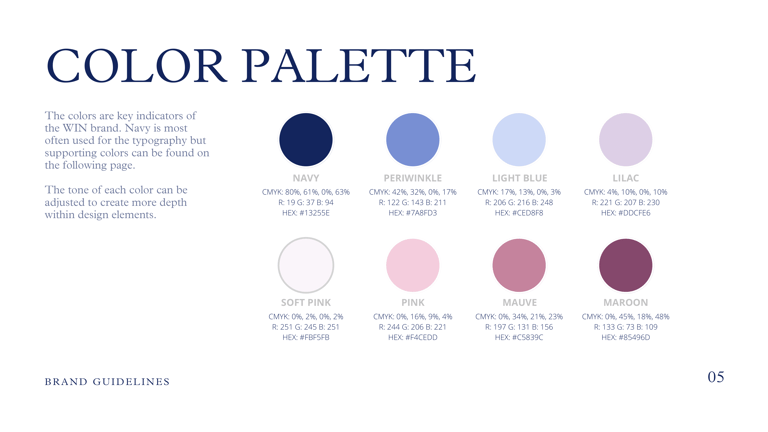 At WIN, I developed a complete set of brand guidelines to define our visual identity, voice, and design system for everyday use. The document set clear direction on tone and messaging, including how we describe the organization and what we emphasize across communications. On the design side, I documented logo usage, typography, color hierarchy, imagery direction, and the repeatable layout elements that make WIN recognizable across touchpoints. I also included examples and templates so the guidelines were practical for quick execution, partner handoffs, and new team onboarding.
